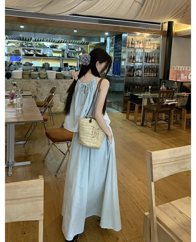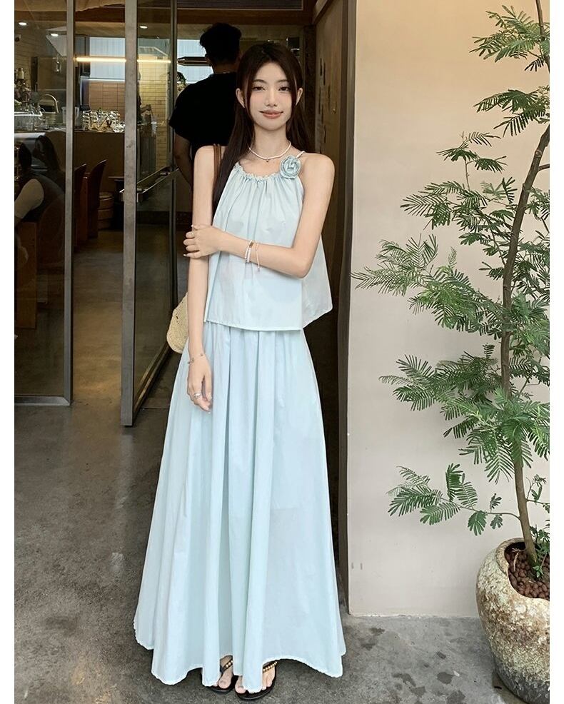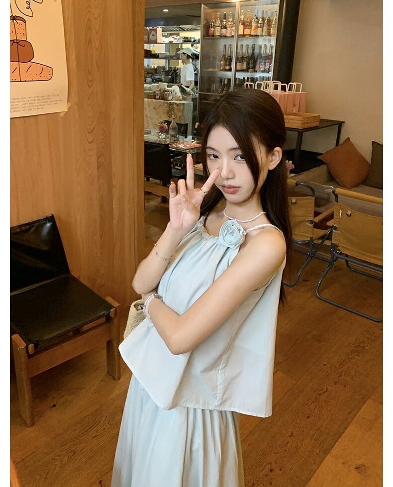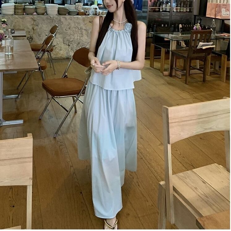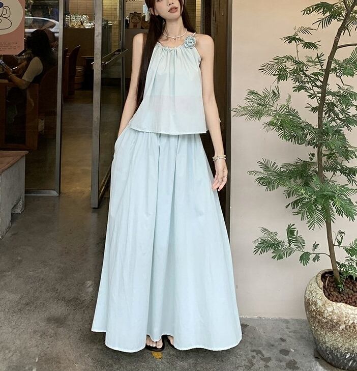 セットアップ ブラウス ノースリーブ キャミソール ホルターネック ノット 紐 お花 モチーフ付き フレアスカート プルオーバー ボトム トップス ドロップショルダー ミモレ丈 Aライン かわいい 大人可愛い シンプル カジュアル きれいめ 上品 おしゃれ こなれ感 キュート 個性的 存在感 春 夏 無地 学生 通学 デート お出かけ 女子会 普段使い 休日 韓国風 オルチャン ファッション コーデ 脚長 S M L ブルー