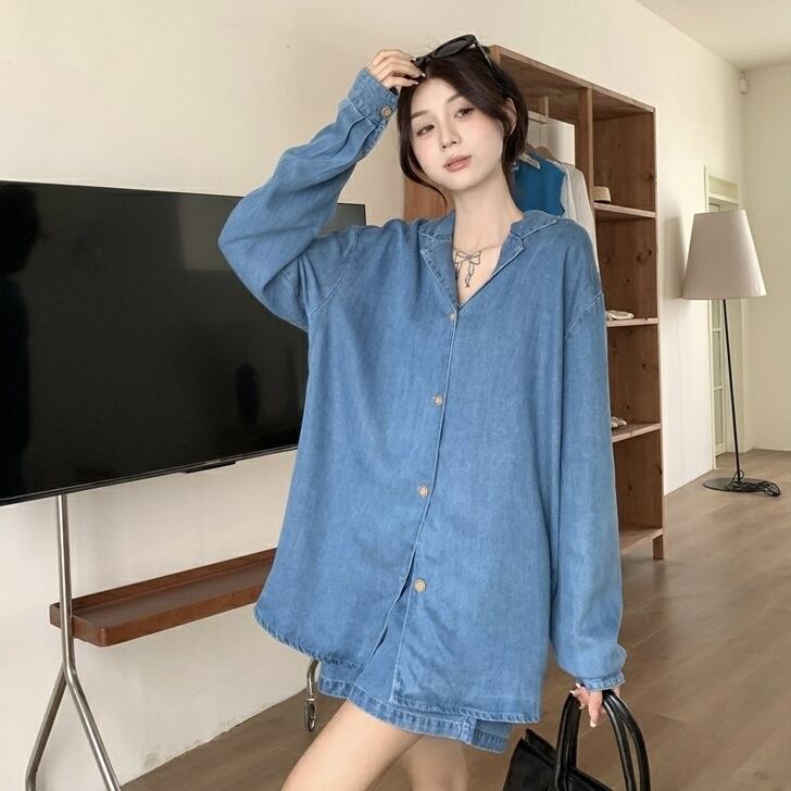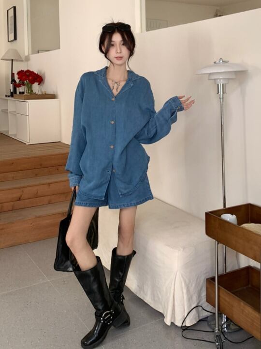 セットアップ デニム ブラウス ジャケット 開襟 オーバーサイズ 長袖 前開き タック ワイドパンツ ショート丈 ボトム トップス フロントボタン ロング丈 Aライン かわいい 大人可愛い シンプル カジュアル きれいめ 上品 おしゃれ こなれ感 キュート 個性的 存在感 春 夏 無地 学生 通学 デート お出かけ 女子会 普段使い 休日 韓国風 オルチャン ファッション コーデ 脚長 S M L ブルー