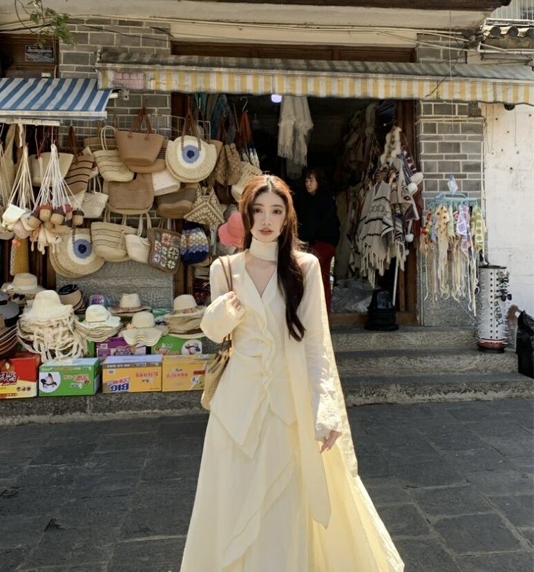 落ち感のあるフレアシルエットが上品でフェミニンなロングスカートのセットアップ。