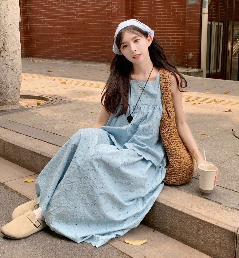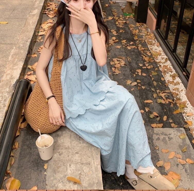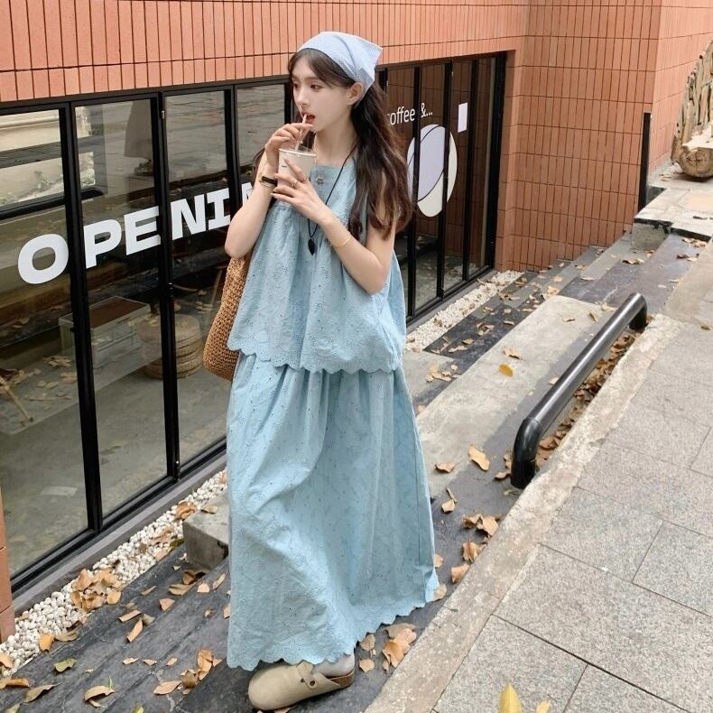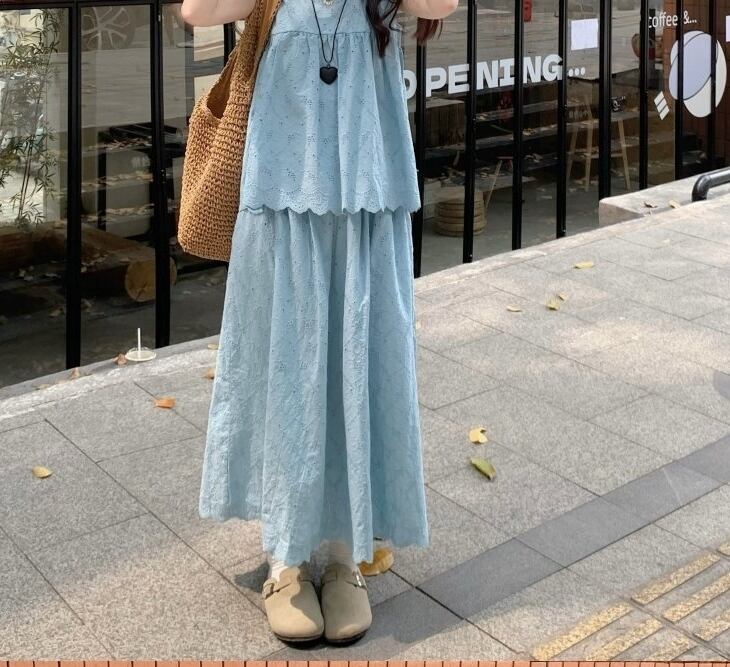 セットアップ ブラウス ノースリーブ タンクトップ パンチングレース スクエアネック スカラップ 花柄 フレアスカート プルオーバー ボトム トップス ミモレ丈 Aライン かわいい 大人可愛い シンプル カジュアル きれいめ 上品 おしゃれ こなれ感 キュート 個性的 存在感 春 夏 無地 学生 通学 デート お出かけ 女子会 普段使い 休日 韓国風 オルチャン ファッション コーデ 脚長 M L ブルー