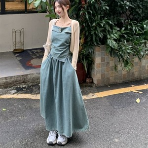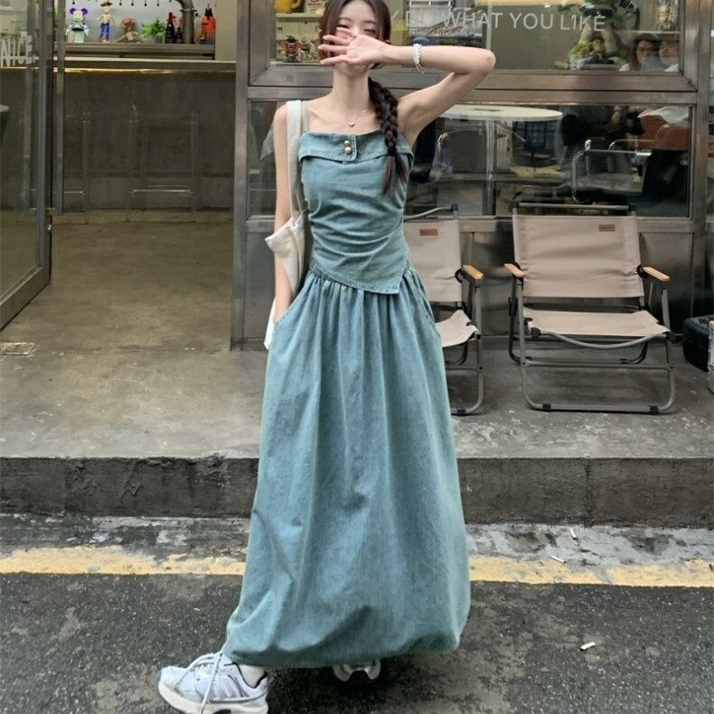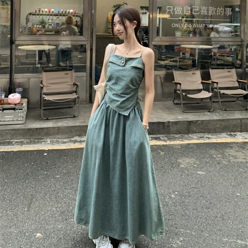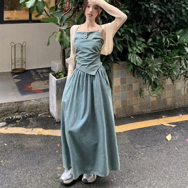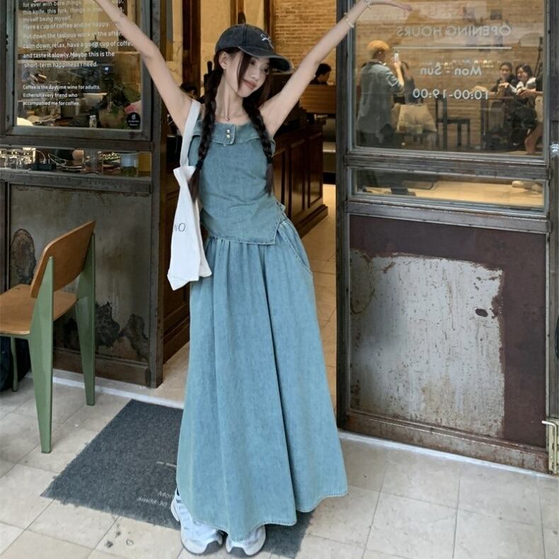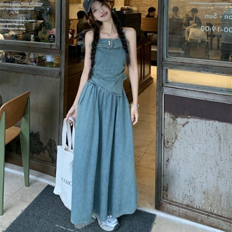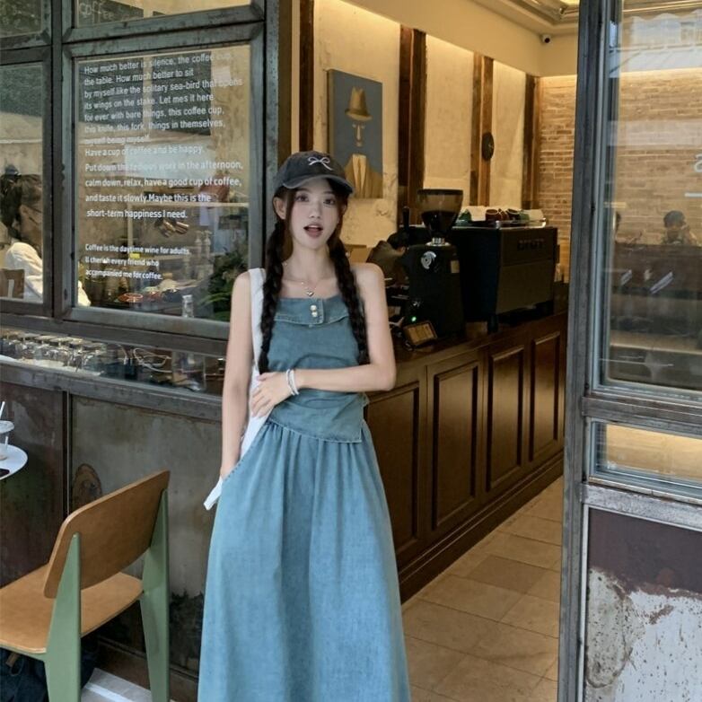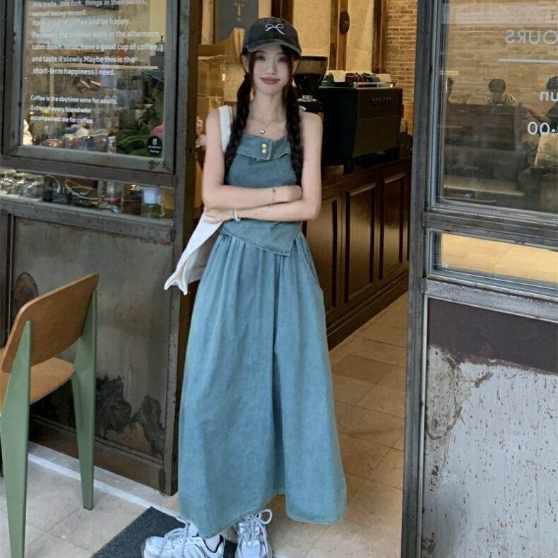 セットアップ ブラウス ノースリーブ キャミソール デニム 金ボタン 変形 イレギュラーヘム ポケットつき フレアスカート プルオーバー ボトム トップス ドロップショルダー ミモレ丈 Aライン かわいい 大人可愛い シンプル カジュアル きれいめ 上品 おしゃれ こなれ感 キュート 個性的 存在感 春 夏 無地 学生 通学 デート お出かけ 女子会 普段使い 休日 韓国風 オルチャン ファッション コーデ 脚長 M L ブルー