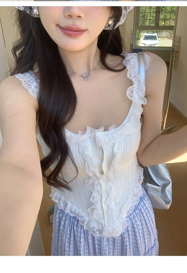 セットアップ キャミソール ティアードスカート ギンガムチェック フリル レース 透け感 ラウンドネック クロップド 裾ギャザー イレギュラーヘム ノースリーブ フリル ボトム トップス ドロップショルダー 襟付き フロントボタン 切り替えデザイン ミモレ丈 Aライン ウエストゴム かわいい 大人可愛い シンプル カジュアル きれいめ 上品 おしゃれ こなれ感 キュート 個性的 存在感 春 夏 無地 学生 通学 デート お出かけ 女子会 普段使い 休日 韓国風 ファッション コーデ 脚長 ワンサイズ