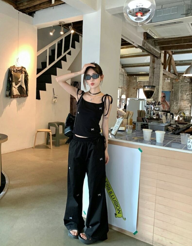 キャミソールはリボン結びの肩紐がガーリーで、パンツはシンプルなワイドタイプです。
