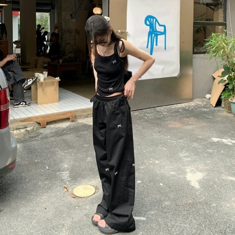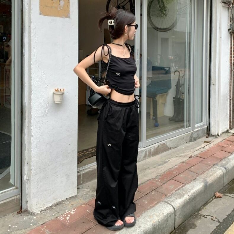 セットアップ キャミソール パンツ ノースリーブ リボン 刺繍 カーゴパンツ ポケット ストラップ 紐 クロップ丈 ウエストゴム ドローストリング ポケット タック ワイドパンツ ウエストゴム ラフパンツ ボトム トップス 切り替えデザイン ロング丈 Aライン ウエストゴム かわいい 大人可愛い シンプル カジュアル きれいめ 上品 おしゃれ こなれ感 キュート 個性的 存在感 春 夏 無地 学生 通学 デート お出かけ 女子会 普段使い 韓国風 ファッション コーデ 脚長 S M L ブラック