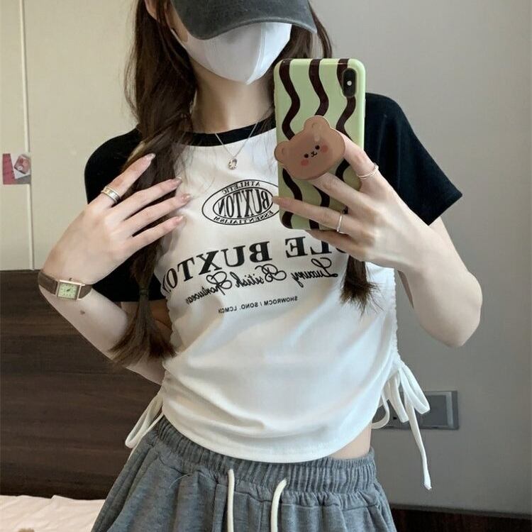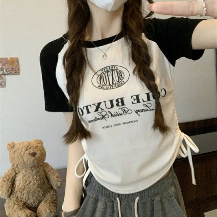 サイドのドローストリングがウエストを細く見せてくれるラグランTシャツです。