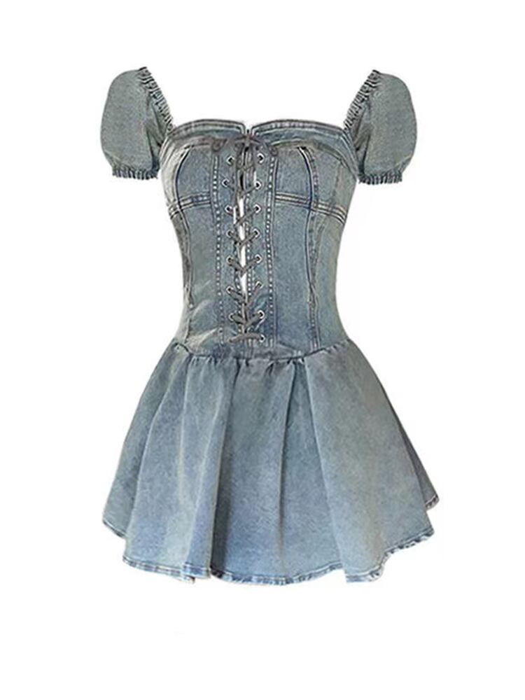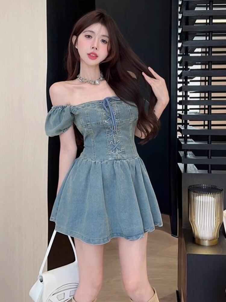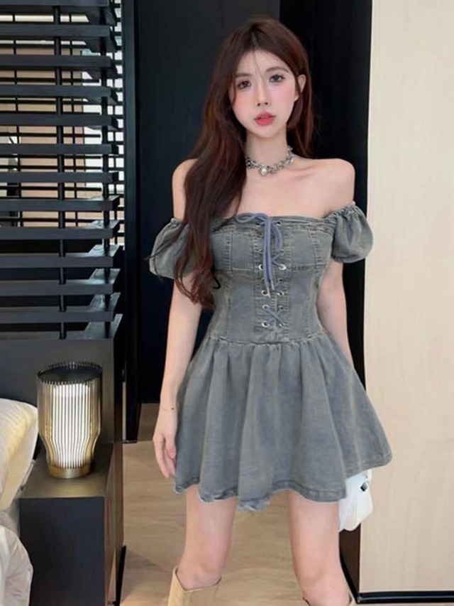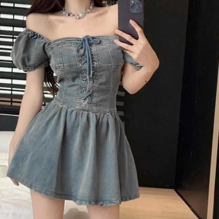 ワンピース ショート丈 ミニ丈 膝上 半袖 オフショルダー 2WAY デニム レースアップ リボン タイト ボディコンシャス リボン ノースリーブ スリム かわいい 大人可愛い きれいめ 大人 上品 おしゃれ お洒落 大人可愛い 大人女子 こなれ感 ラブリー キュート ガーリー クール セクシー エレガント 主役級 存在感 とろみ感 抜け感 無地 結婚式 二次会 披露宴 10代 20代 30代 40代 レディース 女性用 パーティー イベント 着回し 重ね着 ブルー