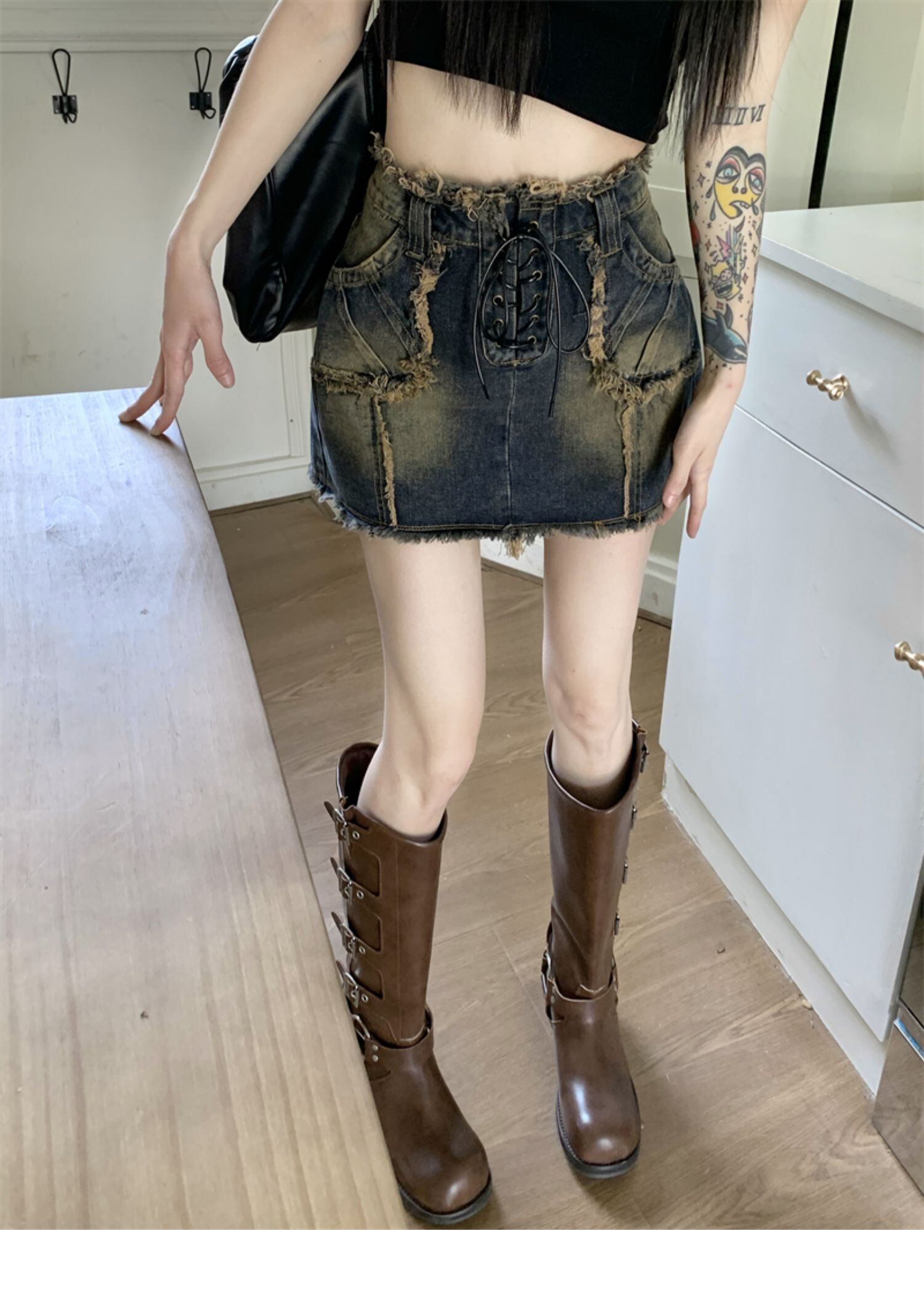 ハイウエストとレースアップが映える自然な台形デザインが女性らしさを引き立てます。