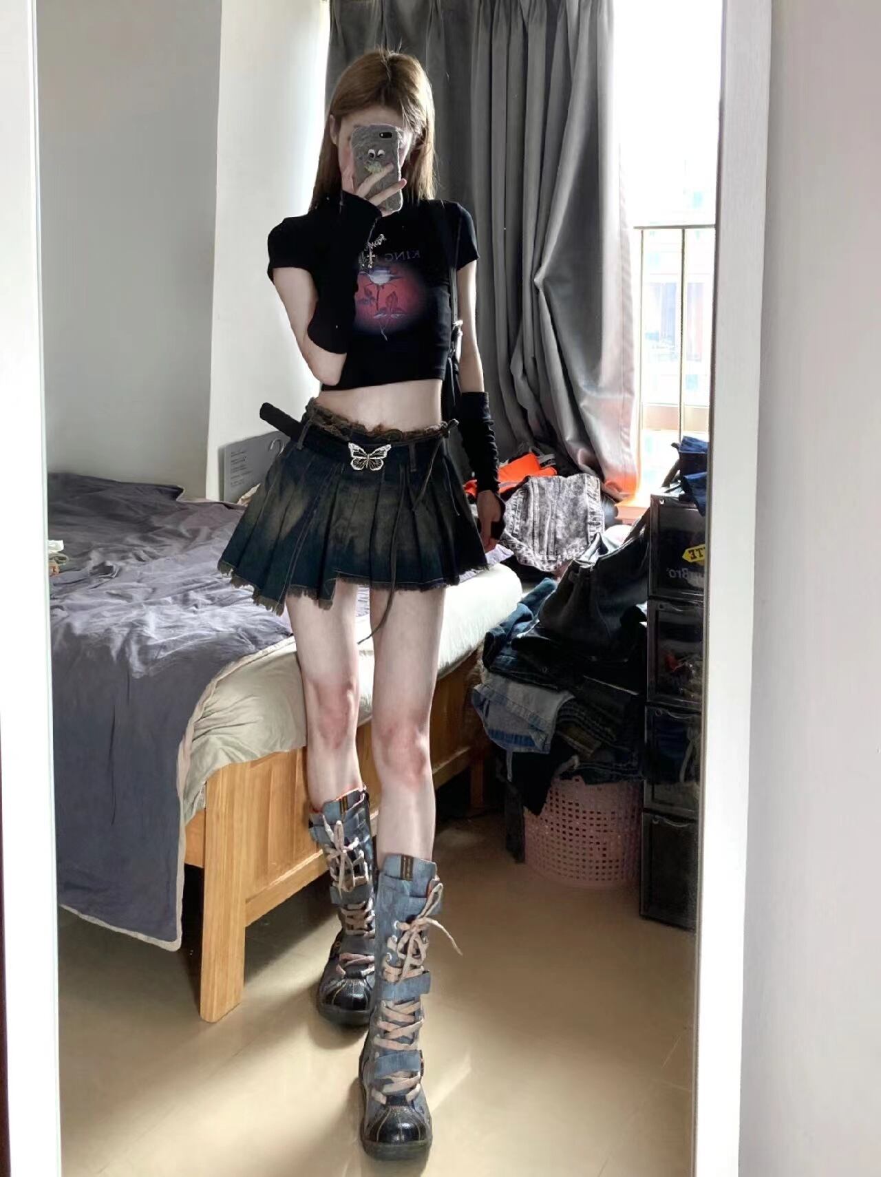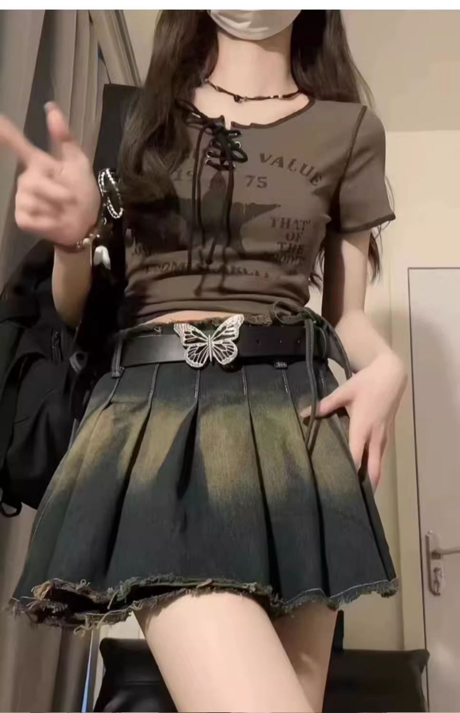 ビンテージな色合いと、大胆なショート丈で脚長効果も期待できます。