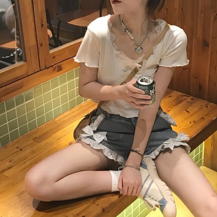 レースとプチリボン付きの襟元が可愛い半袖カットソー。