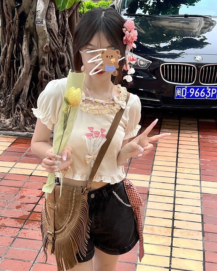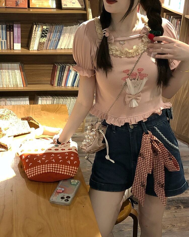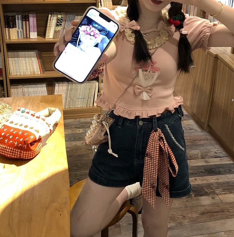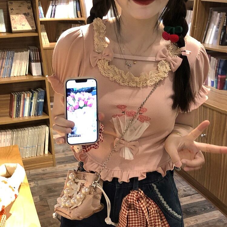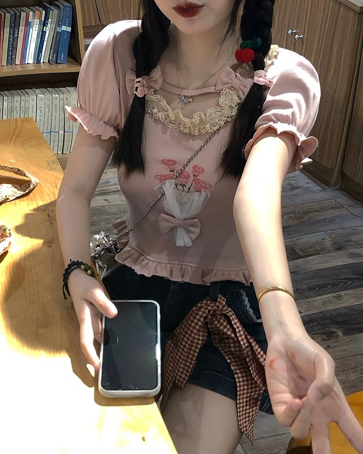 トップス Tシャツ カットソー 袖あり 半袖 細身 タイト ショート丈 ラウンドネック ストラップ 花束 ブーケ メッシュ メロウ リボン レース 切り替え 夢かわいい プリント 伸縮性 きれいめ シンプル カジュアル クラシカル 大人 おしゃれ お洒落 大人可愛い 大人女子 こなれ感 無地 春 夏 10代 20代 30代 40代 レディース 女性用 オフィス OL 通勤 学生 通学 デート お出かけ お泊まり 休日 アウトドア 旅行 着回し 普段使い ピンク ミルク ワンサイズ