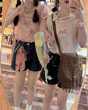 レースとプチリボン付きの襟元が可愛い半袖カットソー。