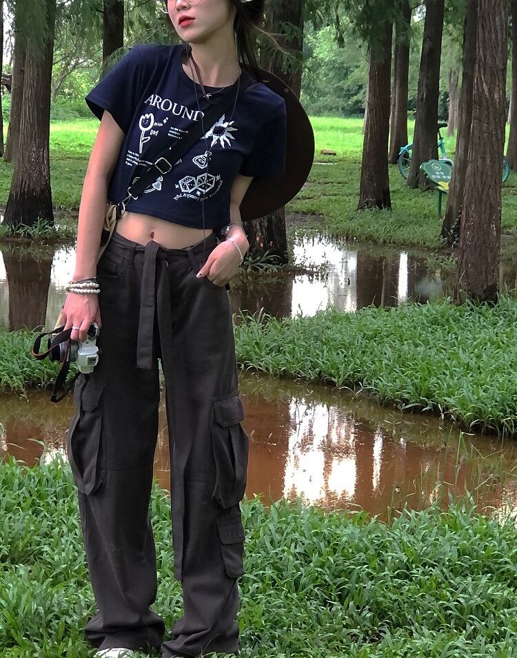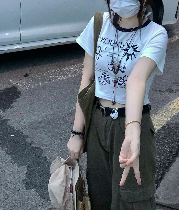 トップス Tシャツ カットソー 袖あり 半袖 クロップ丈 ショート丈 タイト プリント イラスト ゆる可愛い クルーネック スリム ストレート 伸縮性 きれいめ シンプル カジュアル クラシカル 大人 おしゃれ お洒落 大人可愛い 大人女子 こなれ感 無地 春 夏 10代 20代 30代 40代 レディース 女性用 オフィス OL 通勤 学生 通学 デート お出かけ お泊まり 休日 アウトドア 旅行 着回し 普段使い S M L ネイビー ホワイト