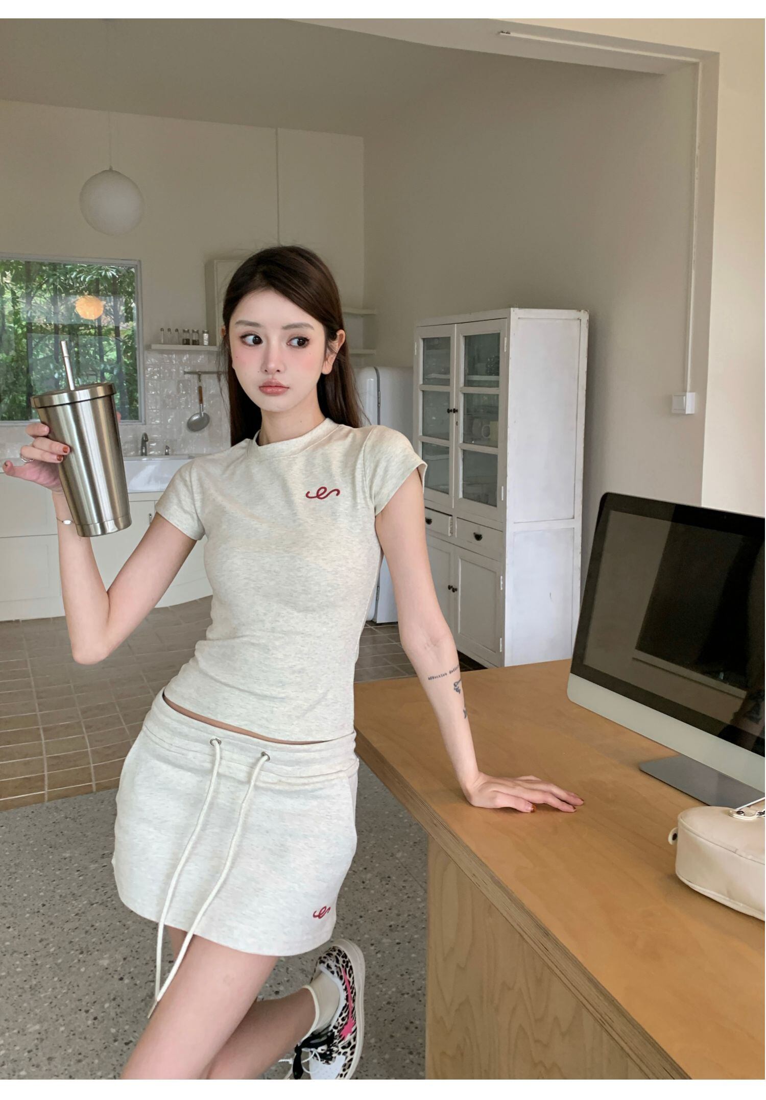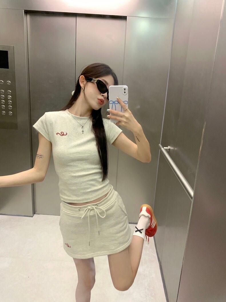 スポーティーなワンポイントのロゴプリント入りTシャツとミニスカートのセットアップです。