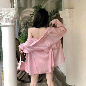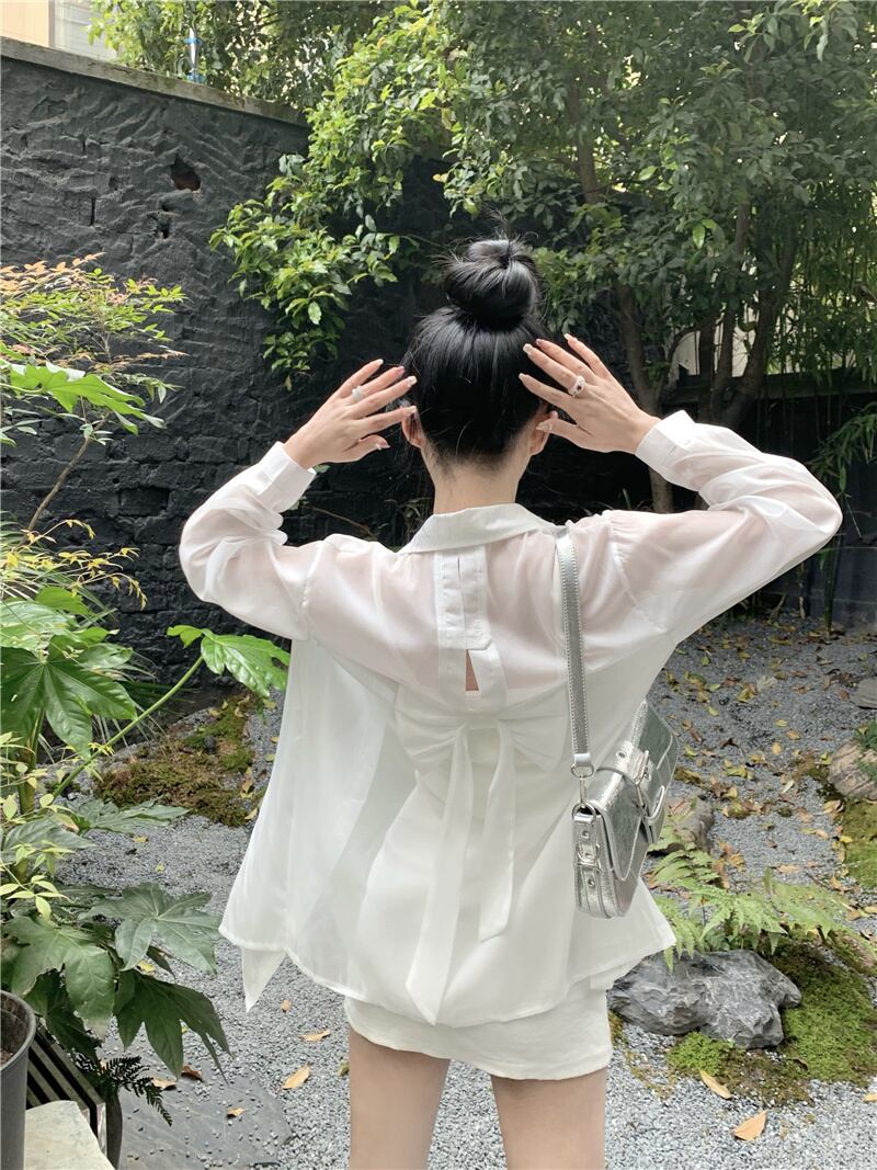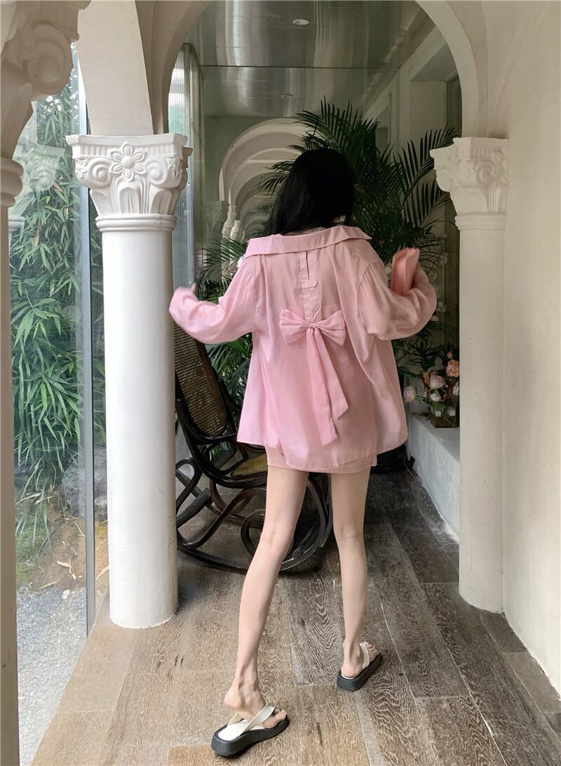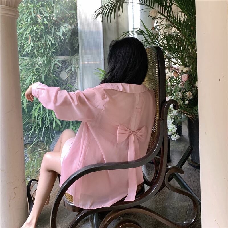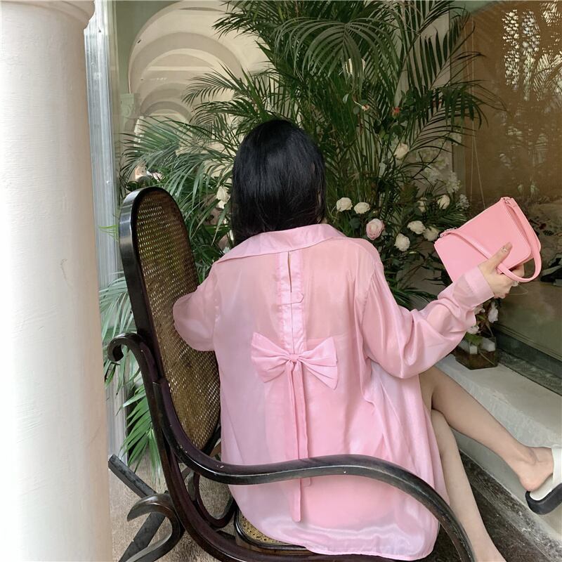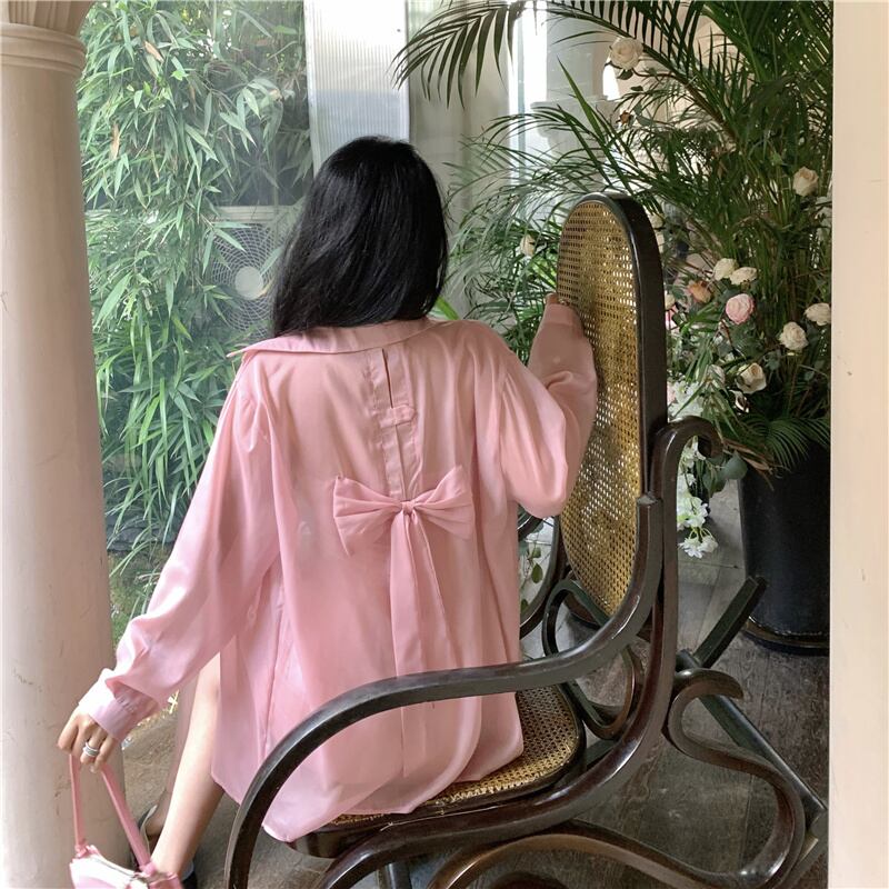 バックにあしらったビッグリボンボリューム感が可愛いシフォンブラウスです。