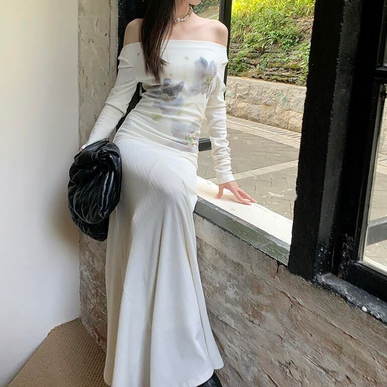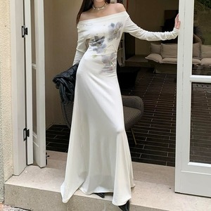 ワンピース 長袖 オフショルダー 花柄 プリント フィッシュテール ロング丈 Aライン ハイウエスト スリム 細身 かわいい きれいめ 大人 上品 お洒落 大人可愛い 大人女子 こなれ感 エレガント セクシー クール モダン シック レトロ フェミニン 主役級 存在感 とろみ感 抜け感 20代 30代 40代 レディース 女性用 お呼ばれ パーティー イベント お出かけ デート ショッピング レストラン 韓国 ファッション トレンド 流行 インスタ映え 脚長 美脚 美スタイル S M 白 ホワイト