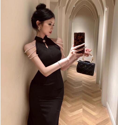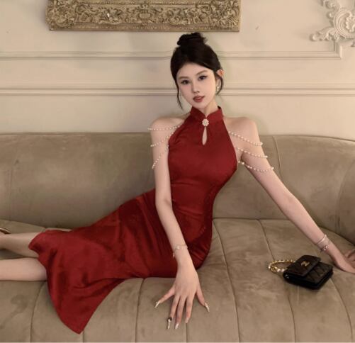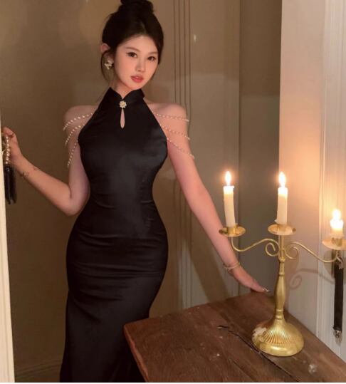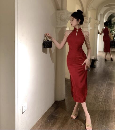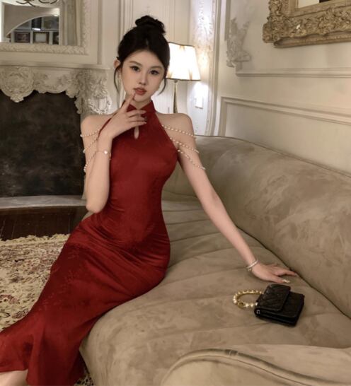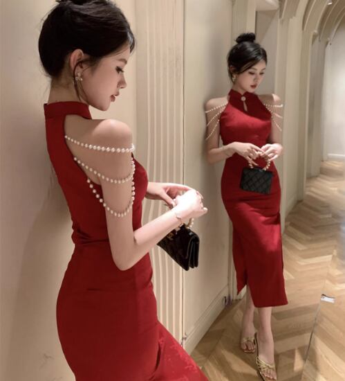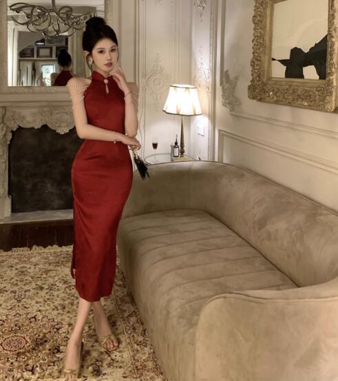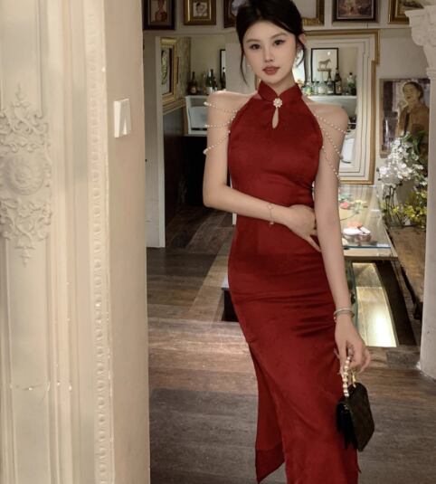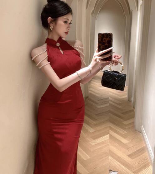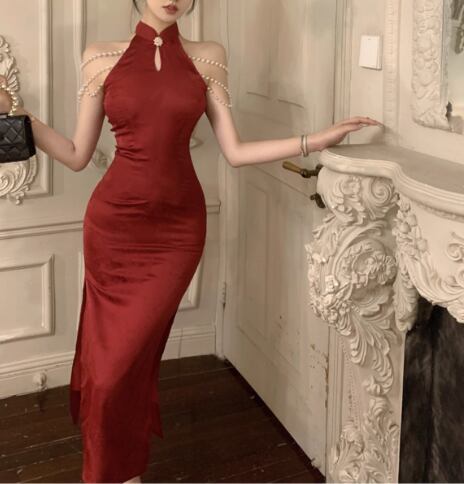 ワンピース チャイナドレス ロング チャイナ風 肌見せ 袖なし ホルターネック パール ノースリーブ タイト 細身 裾フレア きれいめ 大人 上品 レトロ アジアン 優雅 エレガント 春 夏 10代 20代 30代 40代 休日 イベント リゾート 旅行 仮装 コスプレ 撮影会 韓国 韓国系 主役級 存在感 オルチャン ファッション コーデ S M L レッド ブラック 真紅 バーガンディ 黒